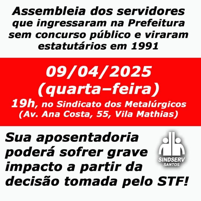 O IPREV reconheceu, agora oficialmente, a regularidade de manter as aposentadorias no Instituto dos servidores incorporados ao Regime Jurídico Único (RJU) pela Lei Complementar 21/1991. Veja o ofício enviado pelo IPREV ao SINDSERV Santos aqui. Não foi conquista de nenhuma ação judicial, conchavo com vereador ou outro político, foi apenas através da organização e luta…